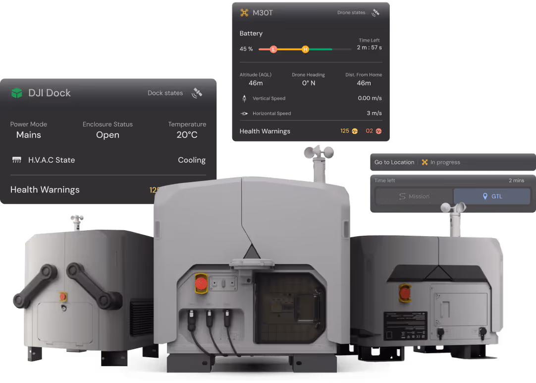 Works seamlessly with all DJI Dock models (1, 2, and 3). Fully integrated with live video, telemetry, and payload systems to deliver consistent performance across diverse sites and deployment setups.