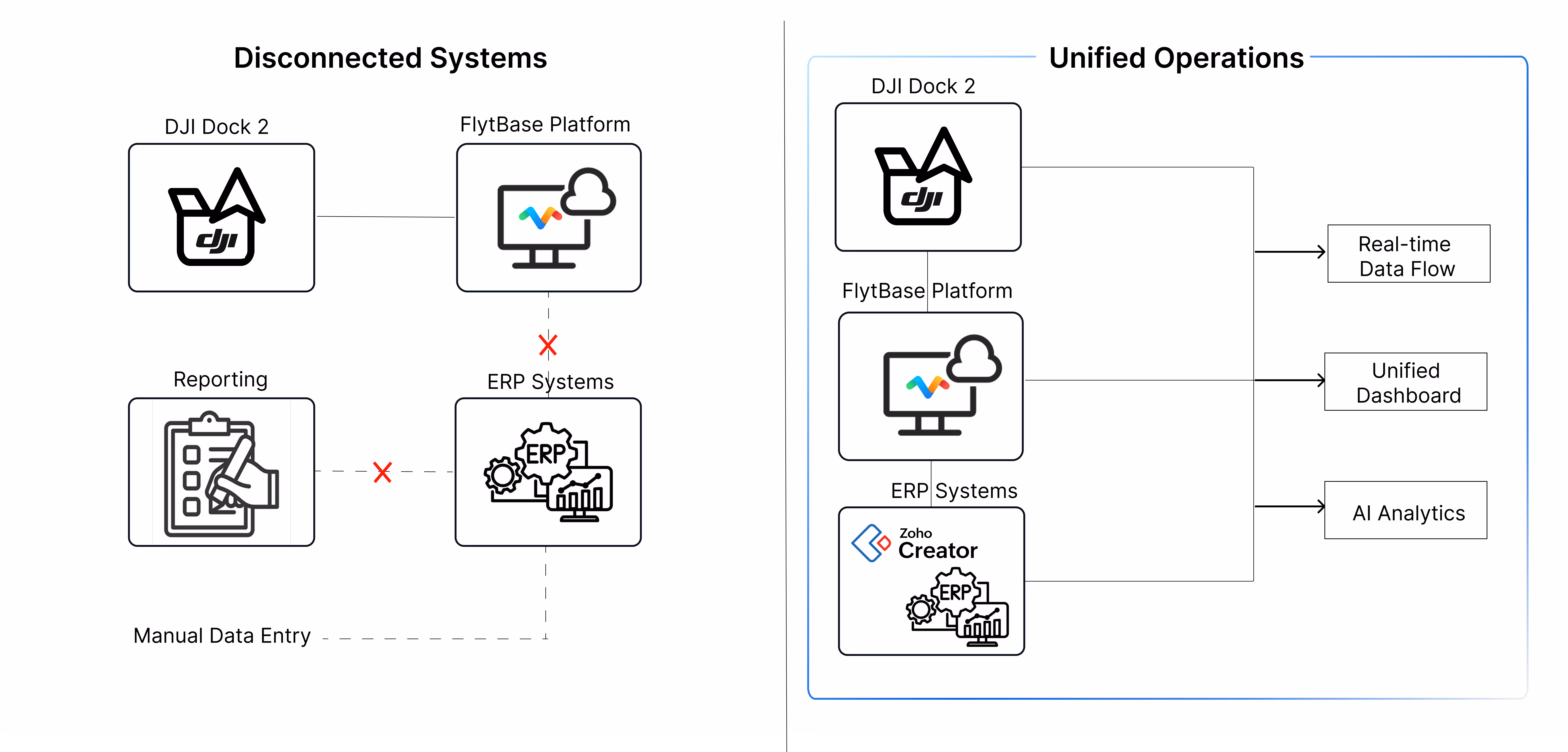 1. Integration Possibilities: Modern cloud platforms enable seamless integration between operational technology (FlytBase drone operations) and business systems (Zoho ERP), creating unprecedented visibility and control.