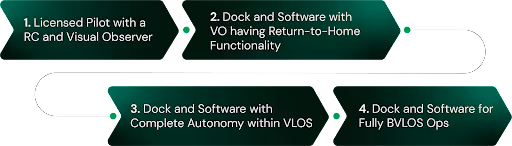 - Dock and Software for Fully BVLOS Ops: Drone operations extend beyond the range specified in phase 3 in the final phase, necessitating a waiver from the regulatory authority of the operating geography. These operations require the use of technology such as Detect and Avoid, UTMs, and others.