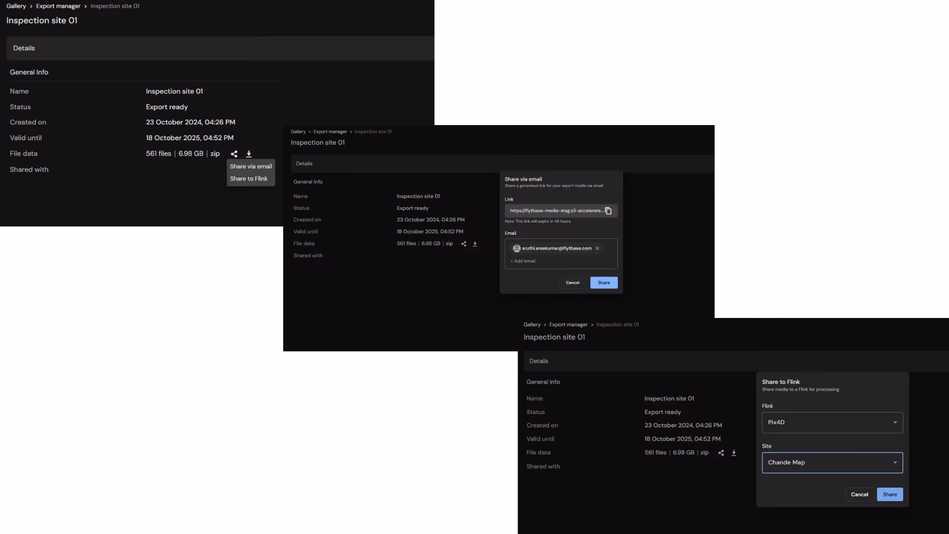 Operators can now easily export images and videos organized by folder or flight ID, either via email as a zip file or directly to third-party data processing software like Pix4D and DroneDeploy. This streamlines the data export process, allowing for seamless post-flight data analysis.