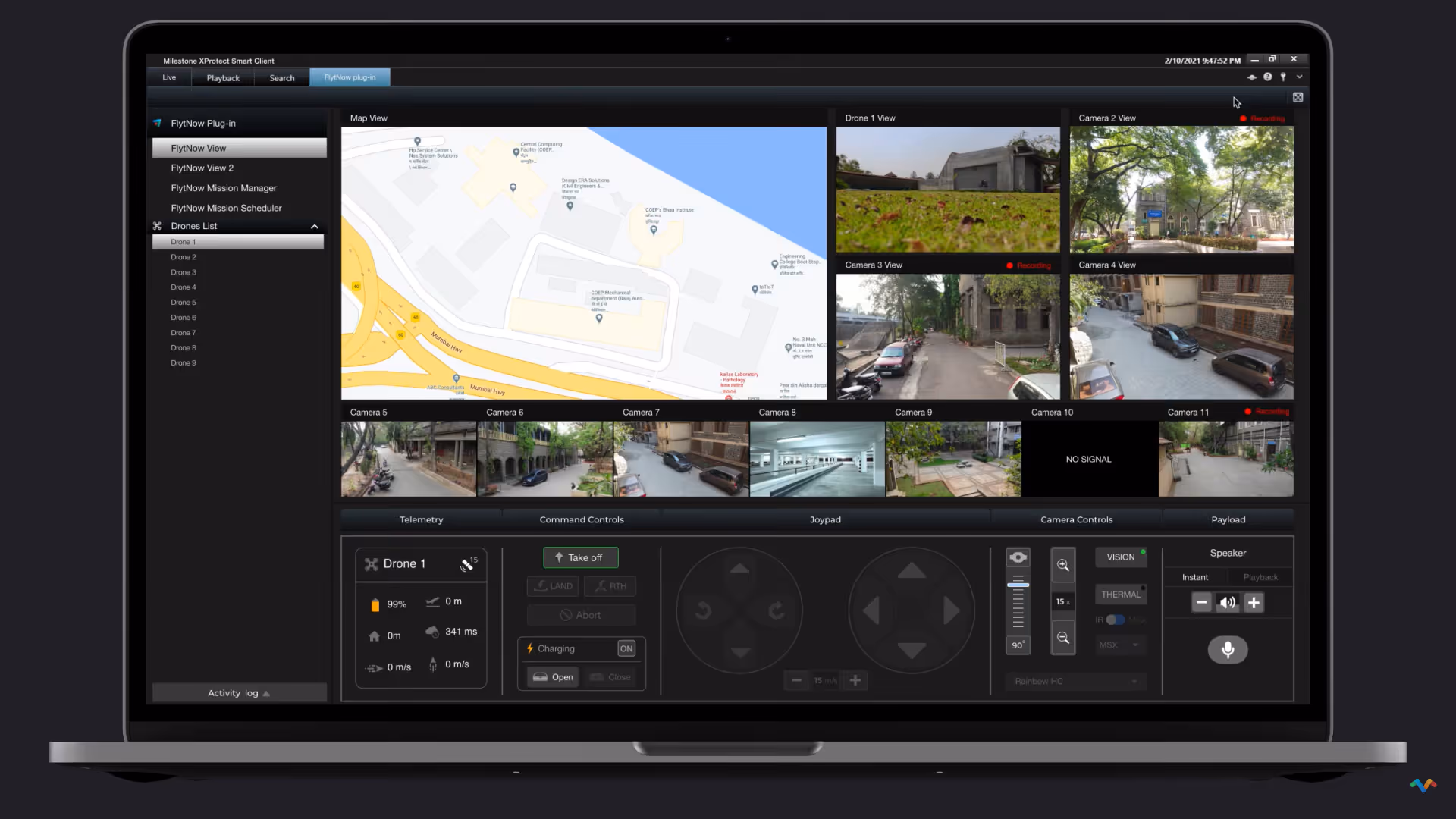 Para cargas útiles como altavoces, cámaras térmicas o focos, FlytBase ofrece una gran cantidad de controles remotos en pantalla y herramientas de visualización. Previa solicitud, los usuarios también pueden integrar sus propias cargas útiles personalizadas con el software. Además, también puede conectar varios programas de terceros, como aplicaciones VMS, UTM y ERP, según sus necesidades.