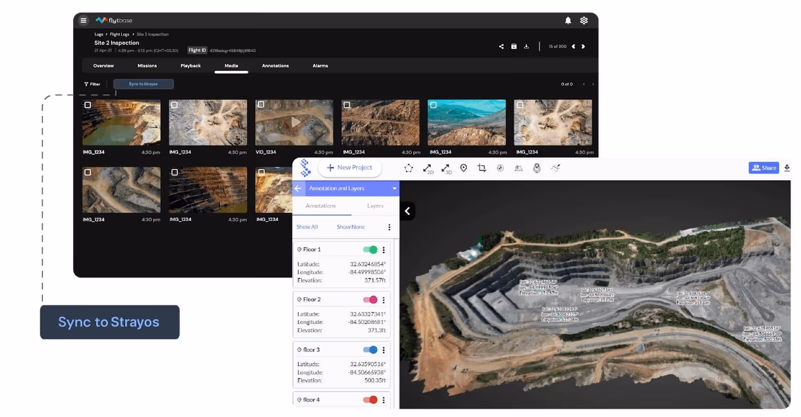 En sectores como la minería y la construcción, Flinks ayuda a las empresas a integrar sin problemas la captura y el análisis de datos de drones en sus flujos de trabajo existentes. Por ejemplo, una obra de construcción puede usar Flinks para cargar automáticamente imágenes aéreas de alta resolución de FlytBase a una plataforma como Pix4D, que luego puede generar modelos e informes 3D detallados para hacer un seguimiento del progreso del proyecto. Del mismo modo, las operaciones mineras pueden aprovechar Flinks para introducir los datos recopilados por drones directamente en herramientas de análisis como Callejeros, lo que permite la supervisión en tiempo real de las condiciones y la productividad del sitio.