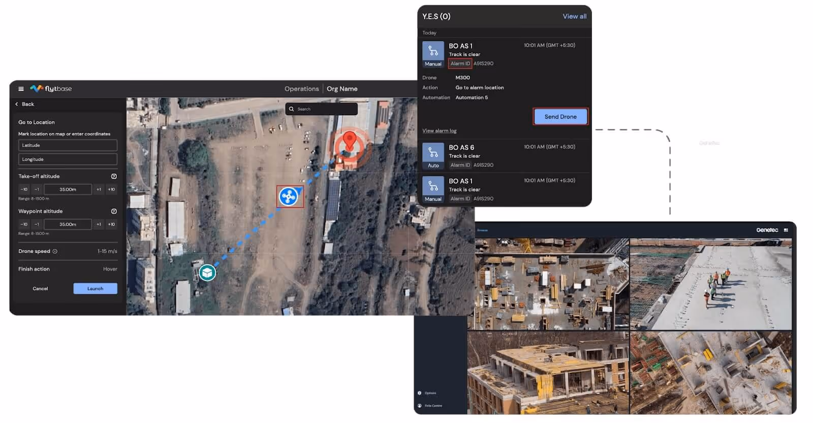Para los casos de uso centrados en la seguridad, Flinks ofrece un conjunto completo de integraciones con sistemas de alarma y software de gestión de vídeo (VMS). Las empresas pueden conectar fácilmente FlytBase a plataformas como Immix, Genetec, Milestone y VideoXpert, lo que permite enviar drones automáticamente en respuesta a las alarmas y mostrar sus transmisiones de vídeo en directo junto con otras imágenes de cámaras de seguridad. Esto proporciona a los equipos de seguridad una visión unificada y en tiempo real de su entorno operativo.