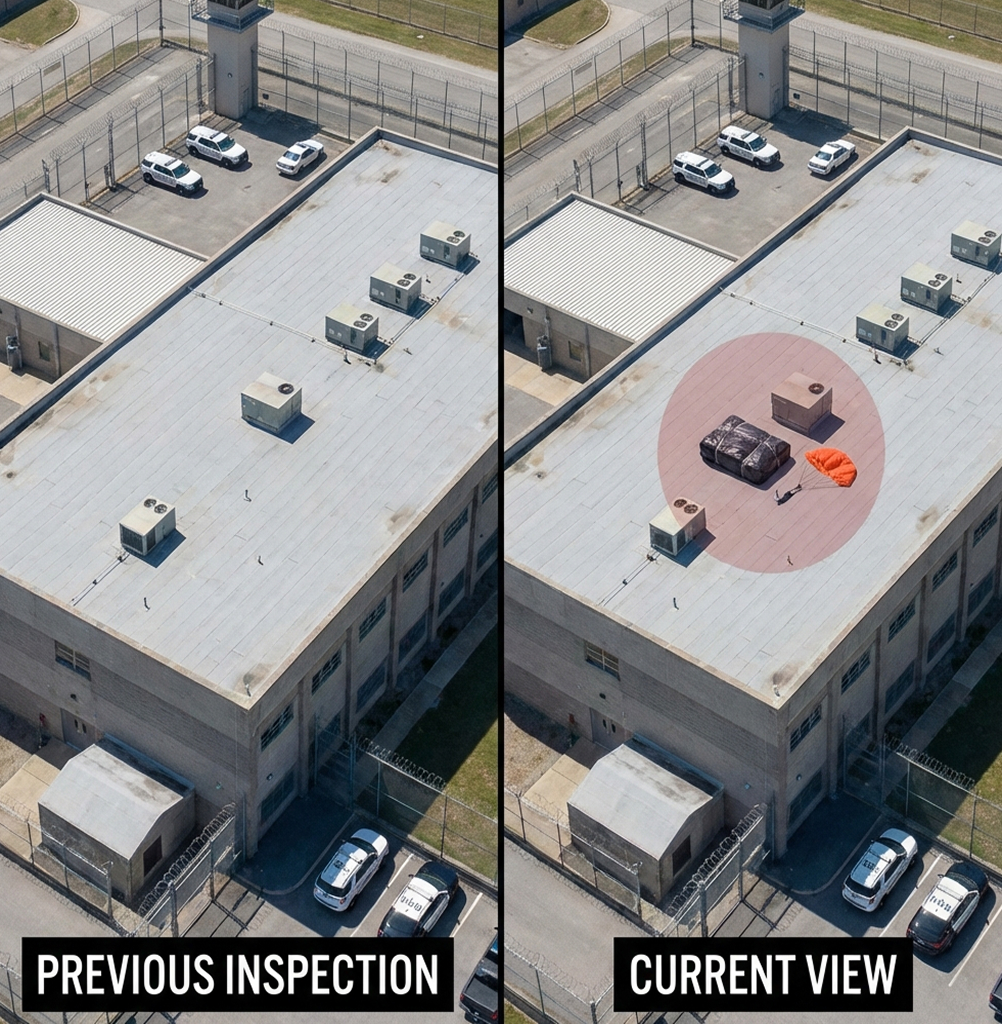 Compare current imagery to historical baseline, highlighting new objects in yards, rooftops, and concealment zones automatically.