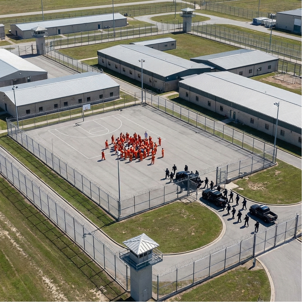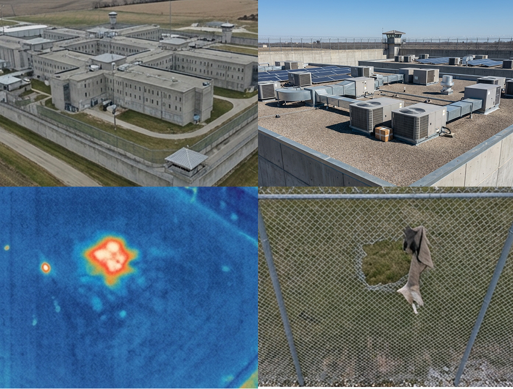 Aerial perspective eliminates blind spots between guard towers. Cover rooftops, drop zones, and remote perimeter sections without expensive camera infrastructure.