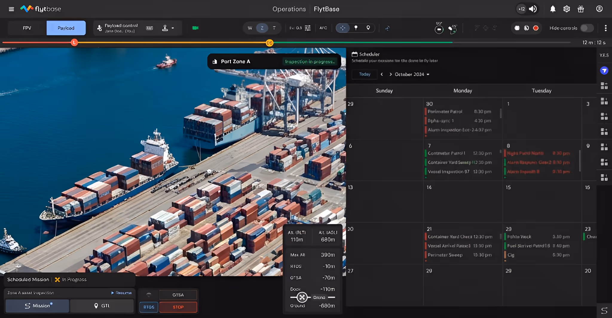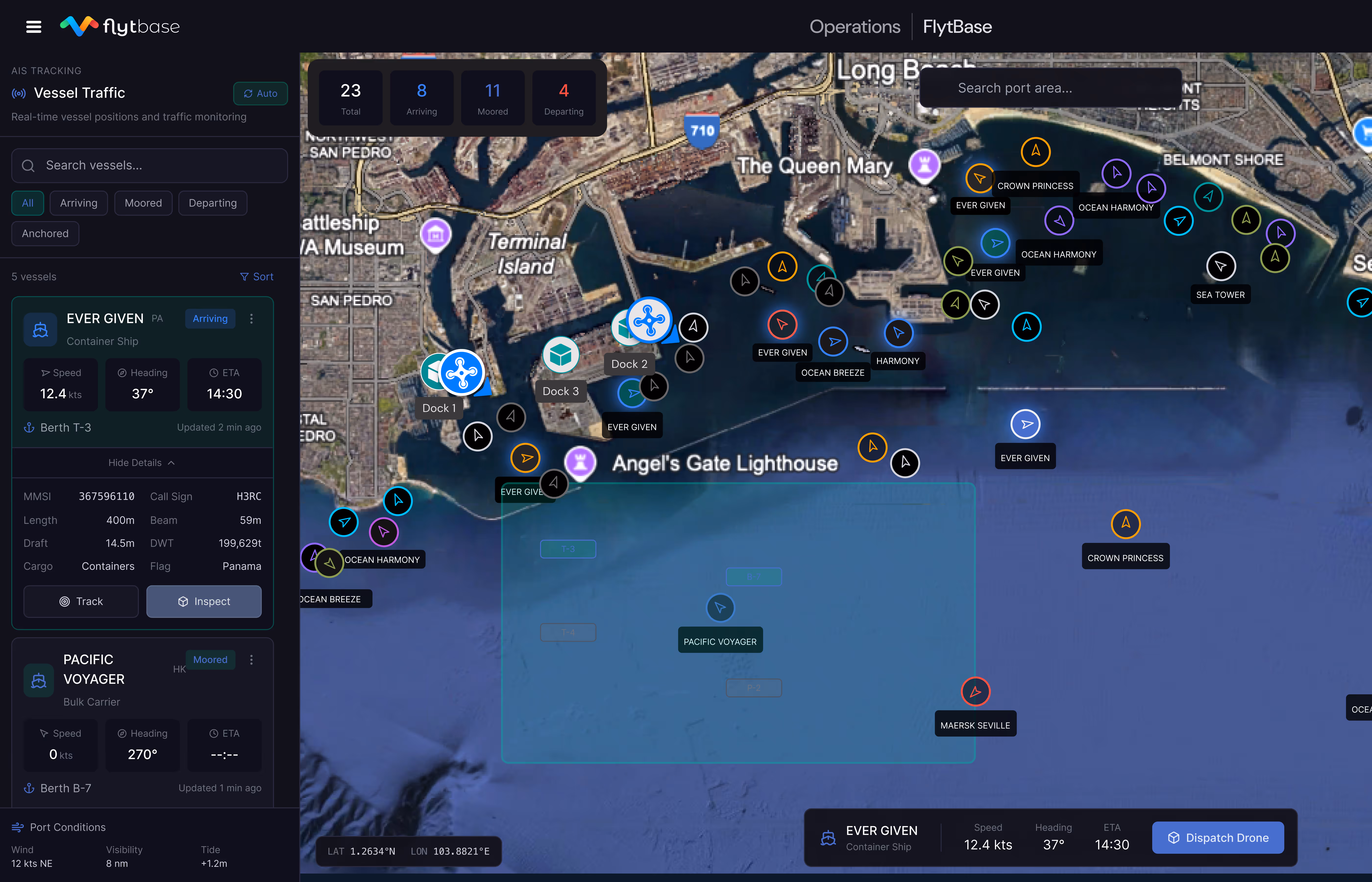 Orchestrate missions, automation workflows, FlytBase AI agents, and vessel tracking through a unified autonomy platform for port operations