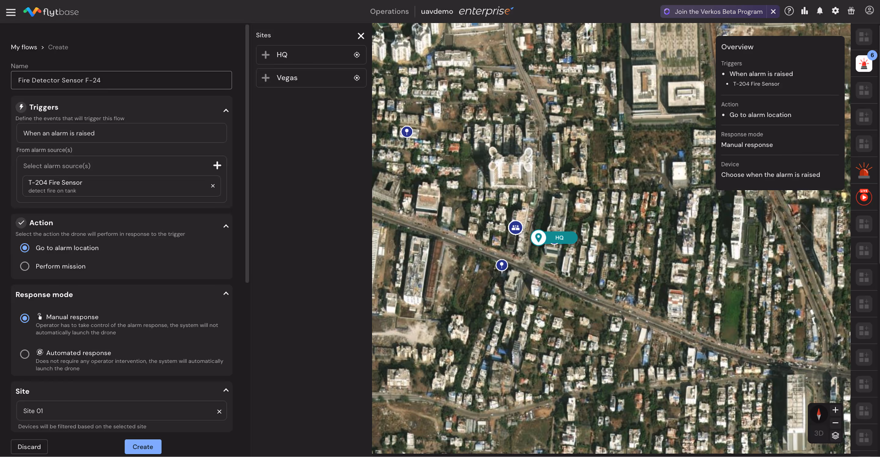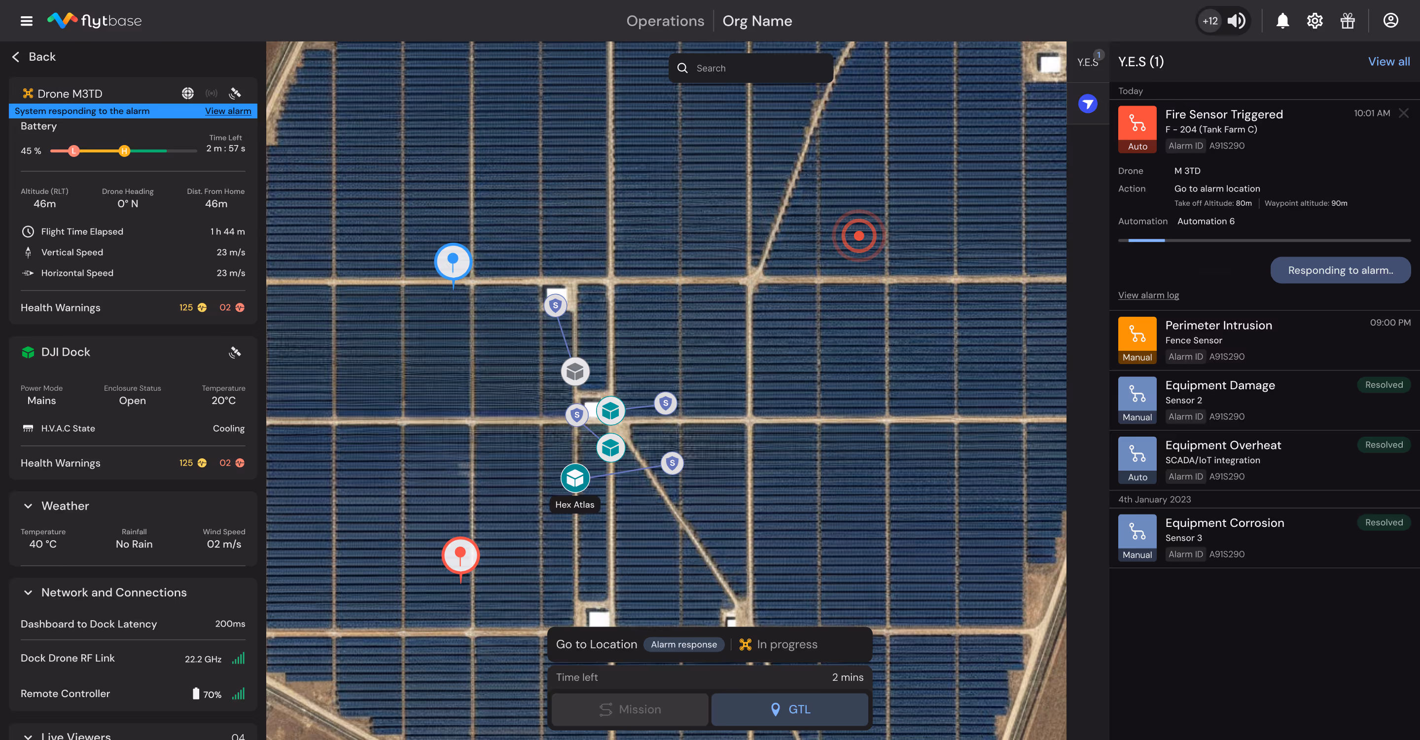 Perimeter alerts and equipment anomalies receive aerial verification within minutes, eliminating false dispatch and enabling immediate threat assessment.