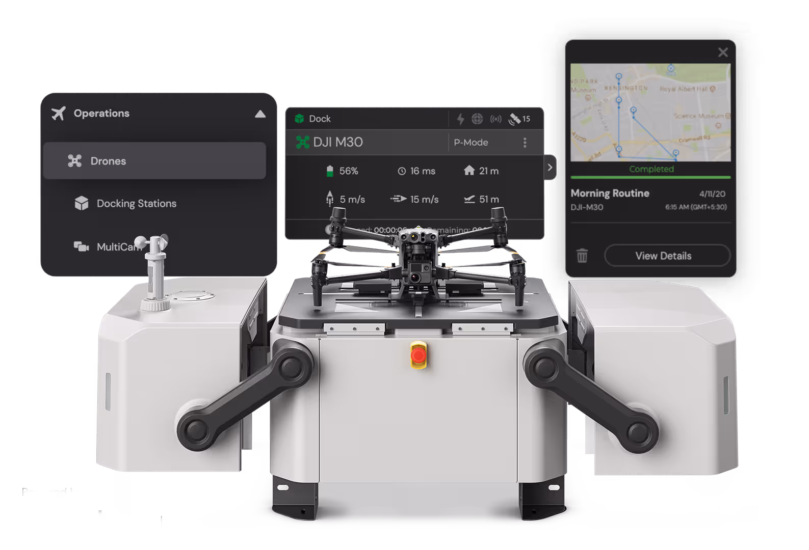 This enables it to execute automated and scheduled missions seamlessly. The dock's IP55 rating and active temperature control ensure that it can function efficiently even in Australia's harsh weather conditions, and it has a backup battery that can last up to 5 hours.